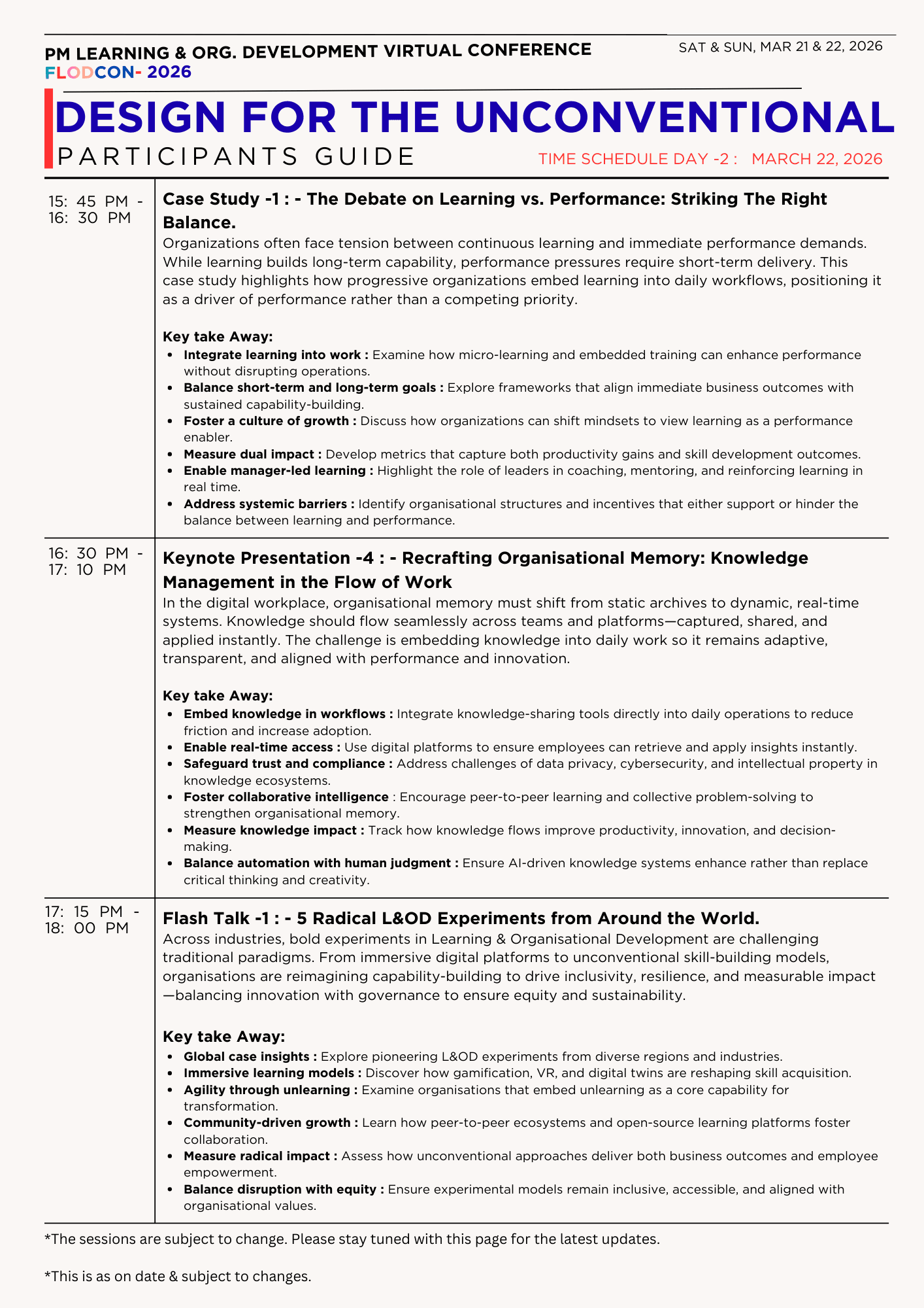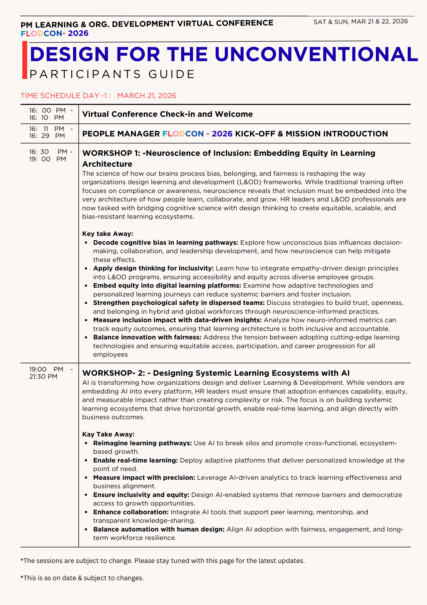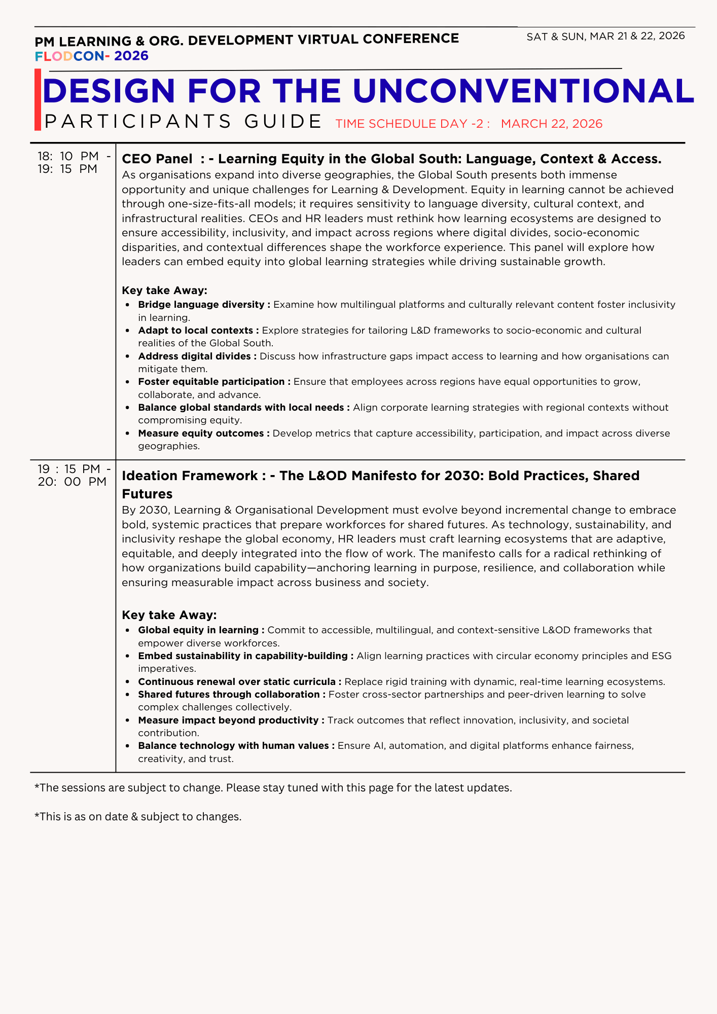 Leaders can no longer focus on a single element in isolation and expect seamless talent development . Instead, they and their teams need a comprehensive 360° view of opportunities and risks to navigate even the most challenging circumstances. This year, we encourage you to switch to wet-weather racing tires and prepare to take on the track with courage and boldness. It's a time for rejuvenation, reflection, and the discovery of ground breaking strategies, trends, and technological advancements in learning & OrganizationJoin an online community of over 5000 talent leaders and collectively make a remarkable shift in mind-sets, skills, and leadership principles to explore the art of the possible for Inclusion – Teach, Talent, and Tactics. By joining us for People Manager FLODCON 2026, you become part of a powerful movement of professionals who are designing for the unconventional.